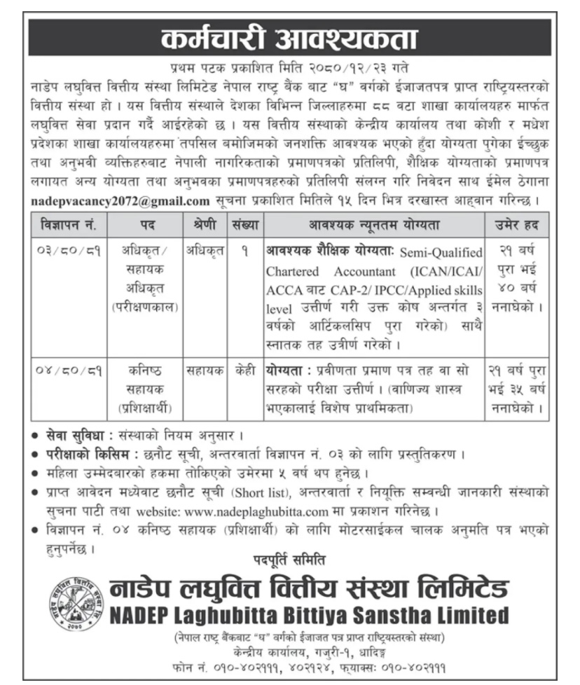 रोजगारीको सुवर्ण अवसर Posted on April 5, 2024 by सेरोफेरो चैत २३, नाडेप लघुवित्त बित्तीय सस्था लि. ले बिभिन्न पदमा आबेदन दिनको लागि विज्ञापन निकालेको छ । Spread the love by sharing this post