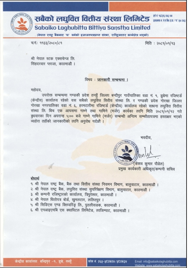 सबैको र साधना लघुवित्त वित्तीय संस्थाबीच मर्जरको लागि अन्तिम सम्झौता Posted on April 25, 2024April 25, 2024 by सेरोफेरो सबैको र साधना लघुवित्त वित्तीय संस्थाबीच मर्जरको लागि अन्तिम सम्झौता भएको छ । यी दुई संस्थाबीच बुधबार मर्जरका लागि अन्तिम सम्झौतापत्रमा हस्ताक्षर भएको हो । १ बराबर १ सेयर स्वाप रेसियोमा मर्जर गर्न लागेका हुन् । Screenshot Spread the love by sharing this post