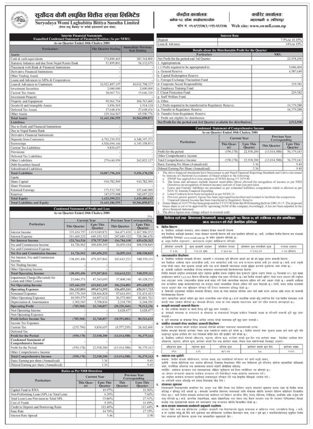 सूर्योदय वोमी लघुवित्तको खुद नाफा २ करोड २९ लाख ३८ हजार रुपैयाँ Posted on May 6, 2024May 6, 2024 by सेरोफेरो सूर्योदय वोमी लघुवित्तको खुद नाफा २ करोड २९ लाख ३८ हजार रुपैयाँ Spread the love by sharing this post